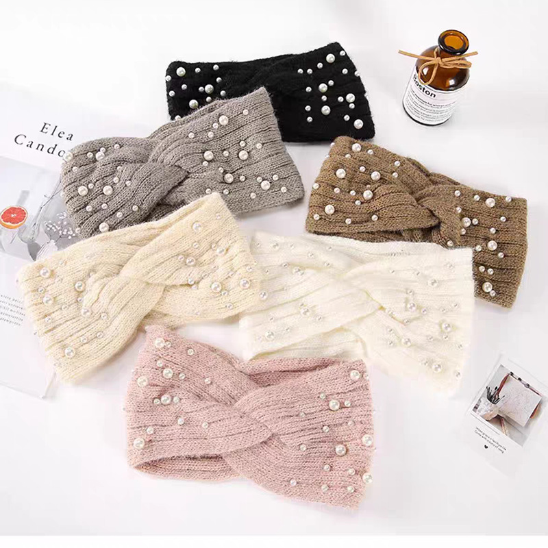 Mode femmes hiver perle chaud bandeau de cheveux élastique en peluche tricoté couleur unie tissé bandeau doux large bord cheveux accessoires
